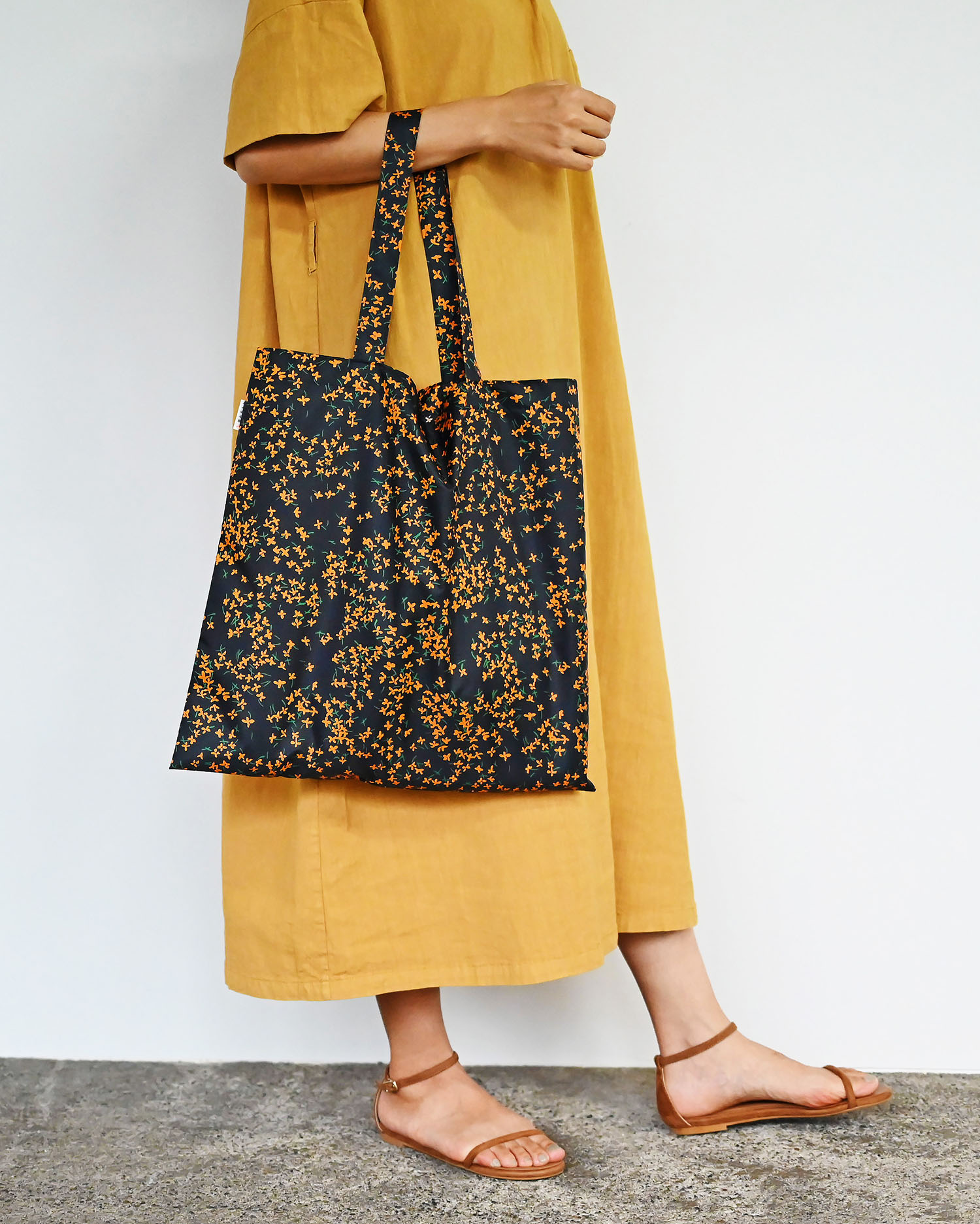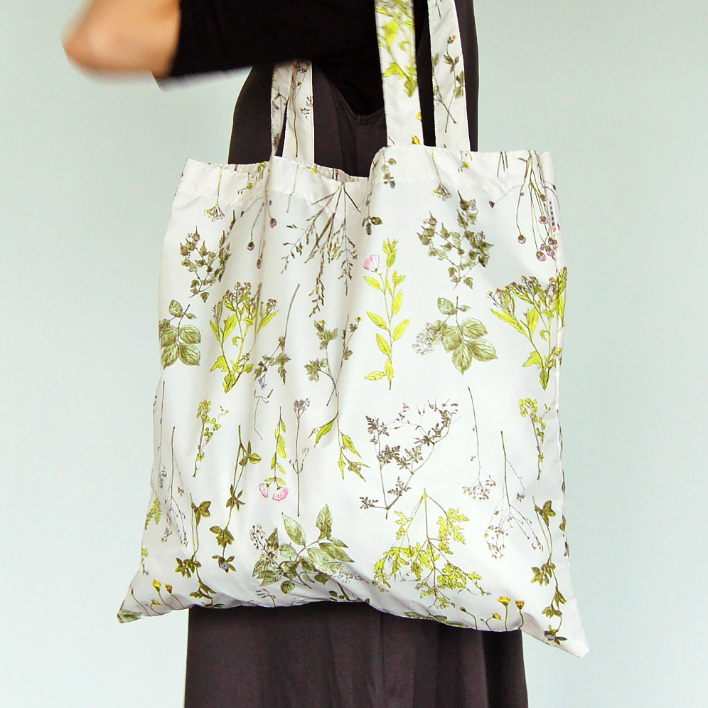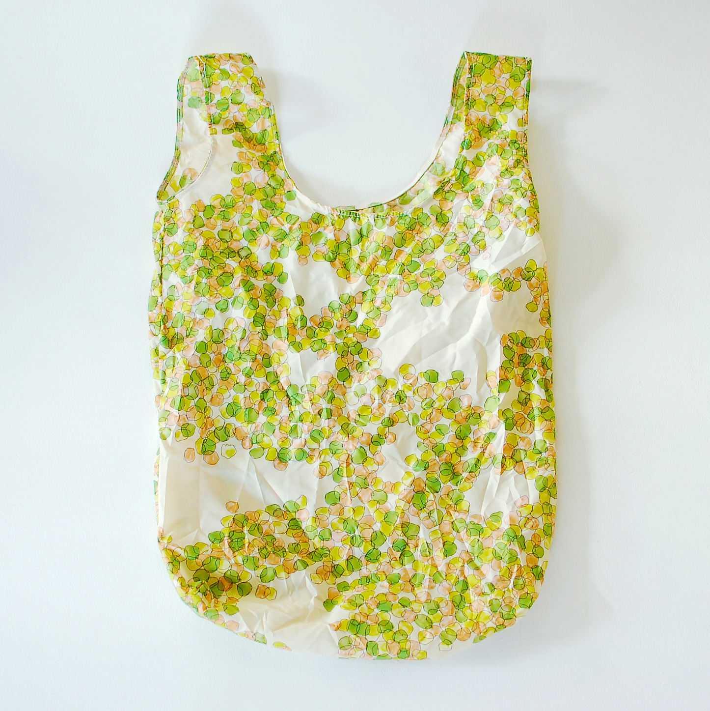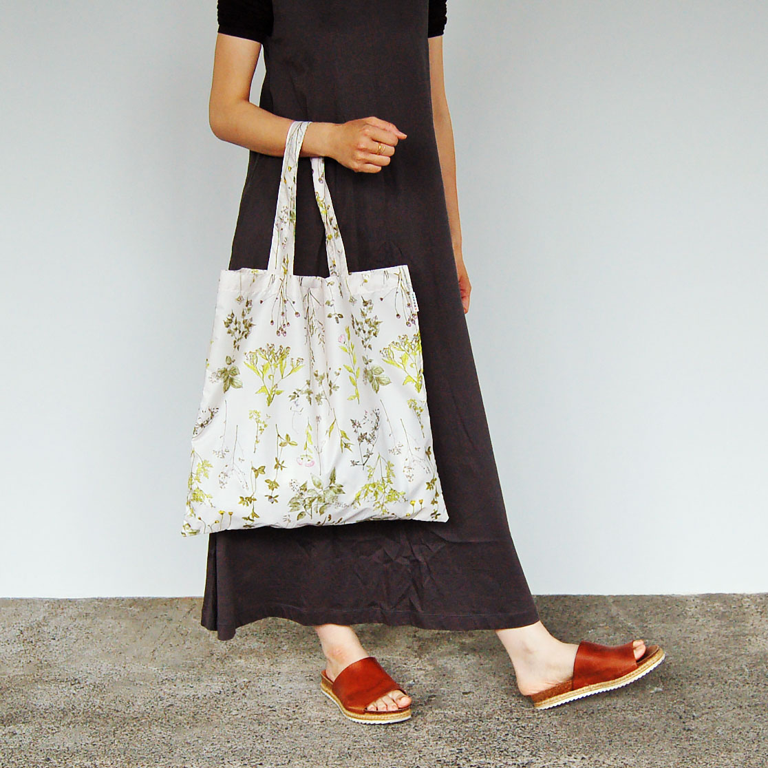 2021年の新作「キンモクセイ」の雨の日トートバック。イイダ傘店の代表作のひとつ「押花」。くしゅくしゅっと小さく丸くなる、お買い物にいい「こもれび」のエコバック。