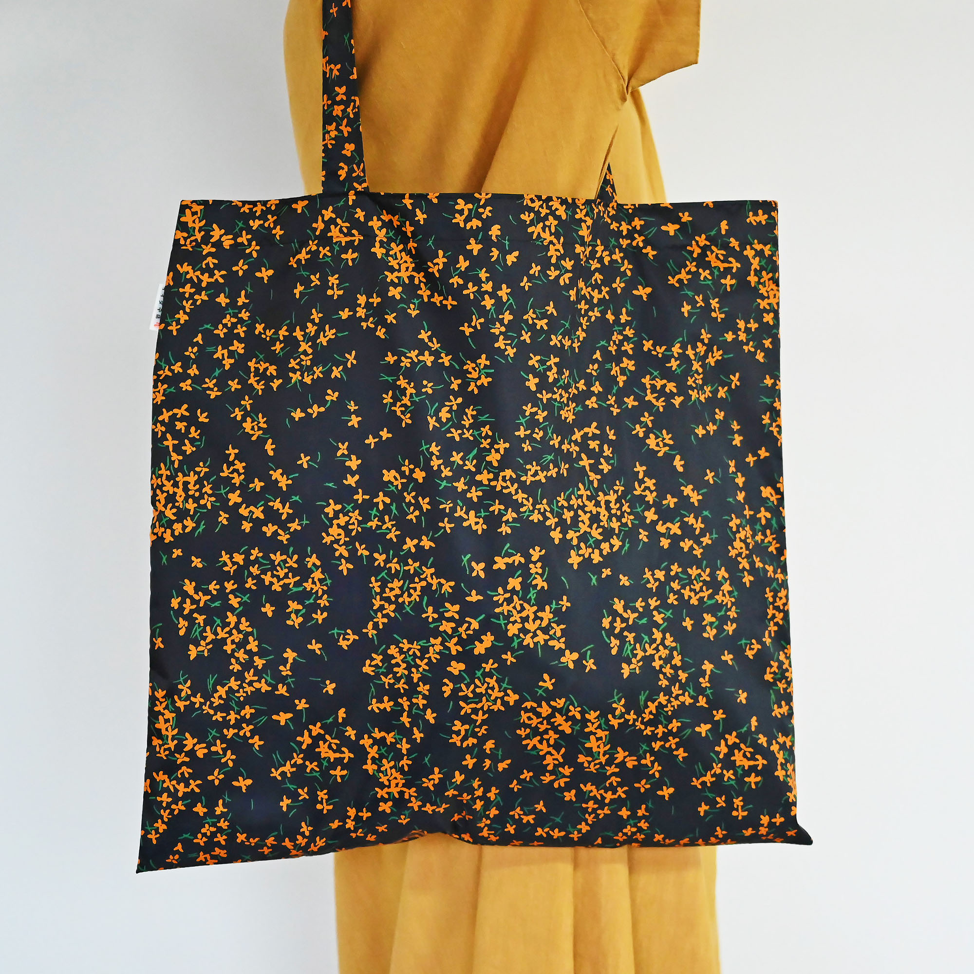 黒地に鮮やかなオレンジの花が咲く「キンモクセイ」柄