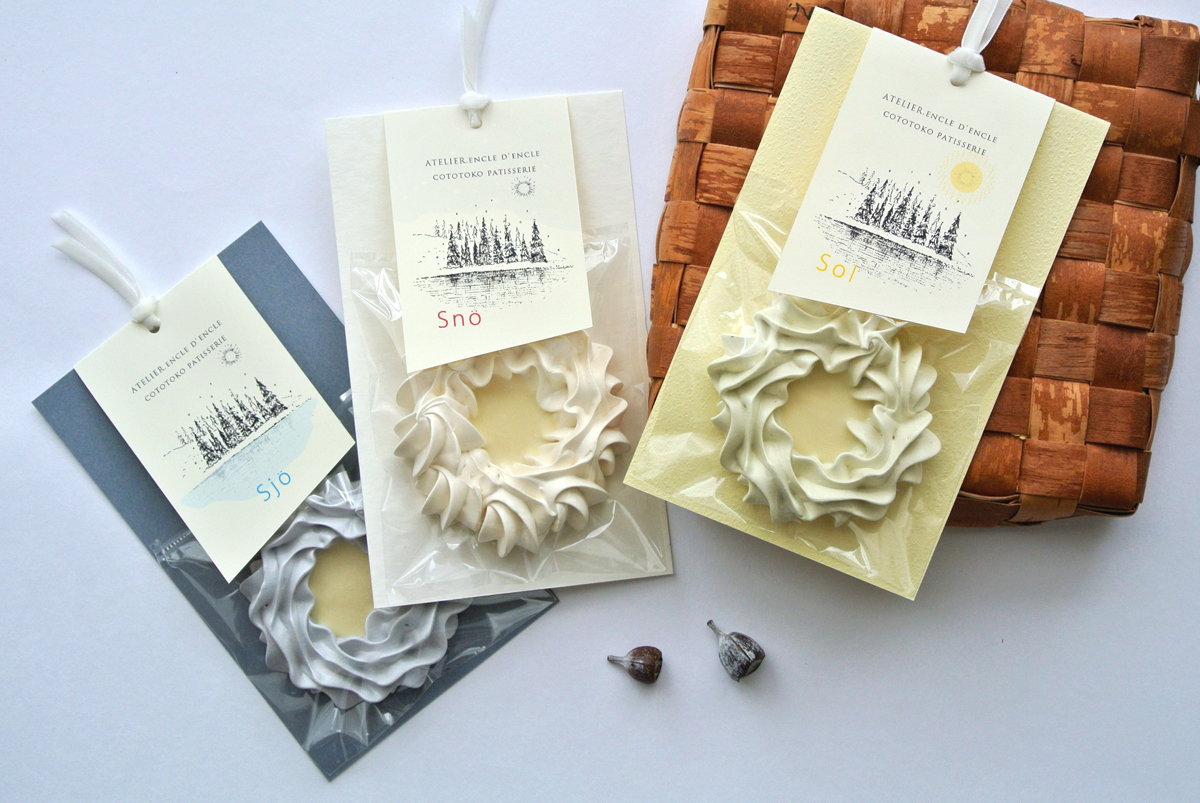 北欧をイメージする白・青・黄色の3色のレターセットには、スウェーデン語で名前がついています。白のレター Snö(スナー)は雪、青のレター Sjö(ショー)は湖。 黄色のレター Sol(ソール)は太陽という意味。アンクルダンクルさんの白樺の森と湖畔が描かれたオリジナルタグつきの「クリスマスレター」 には、 アンクルダンクルさんがセレクトしたレターセットやカード、コトトコ パティスリーさんとのコラボ菓子 米粉のサブレ〈リサブレ ココ〉、ひみつのスイーツ〈メレンゲのクリスマスリース〉がパッケージされています。