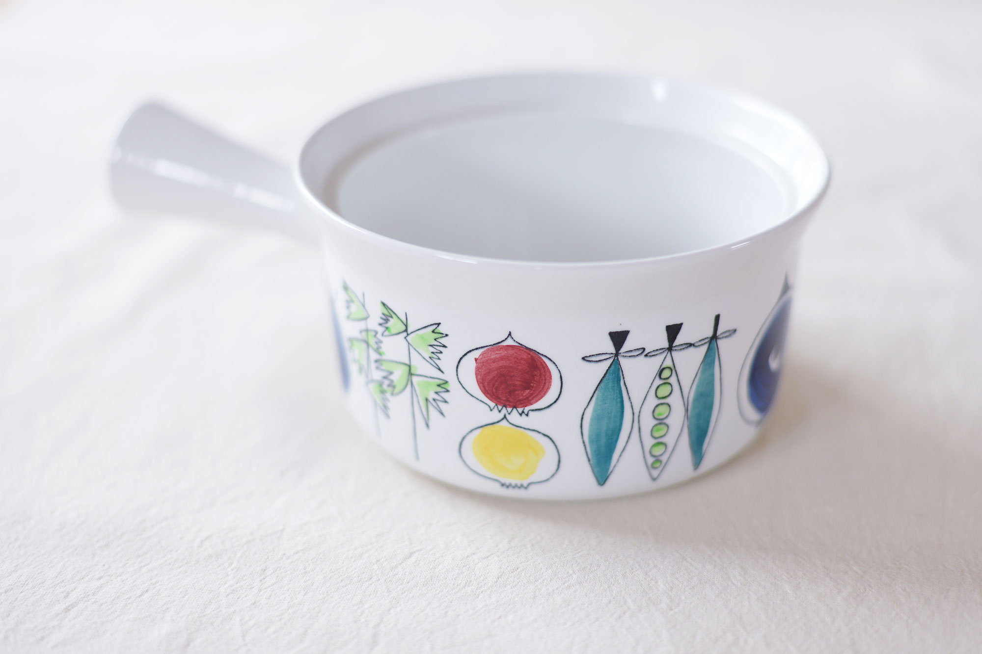 タマネギ、赤カブ、ニンジン、エンドウ豆など、ポップな野菜が描かれたマリアンヌ・ウエストマンのピクニック〈PiCKNiCK〉。ロッピスで見つけたピクニックの鍋に一目惚れ。傷もほとんどなく、鍋底には〈Rörstrand〉の刻印が。お値段は500SEK(約7,500円)……ほしい!店のおじさんも「どうだ?うちのマリアンヌは美しいだろう?」と鼻高々です。