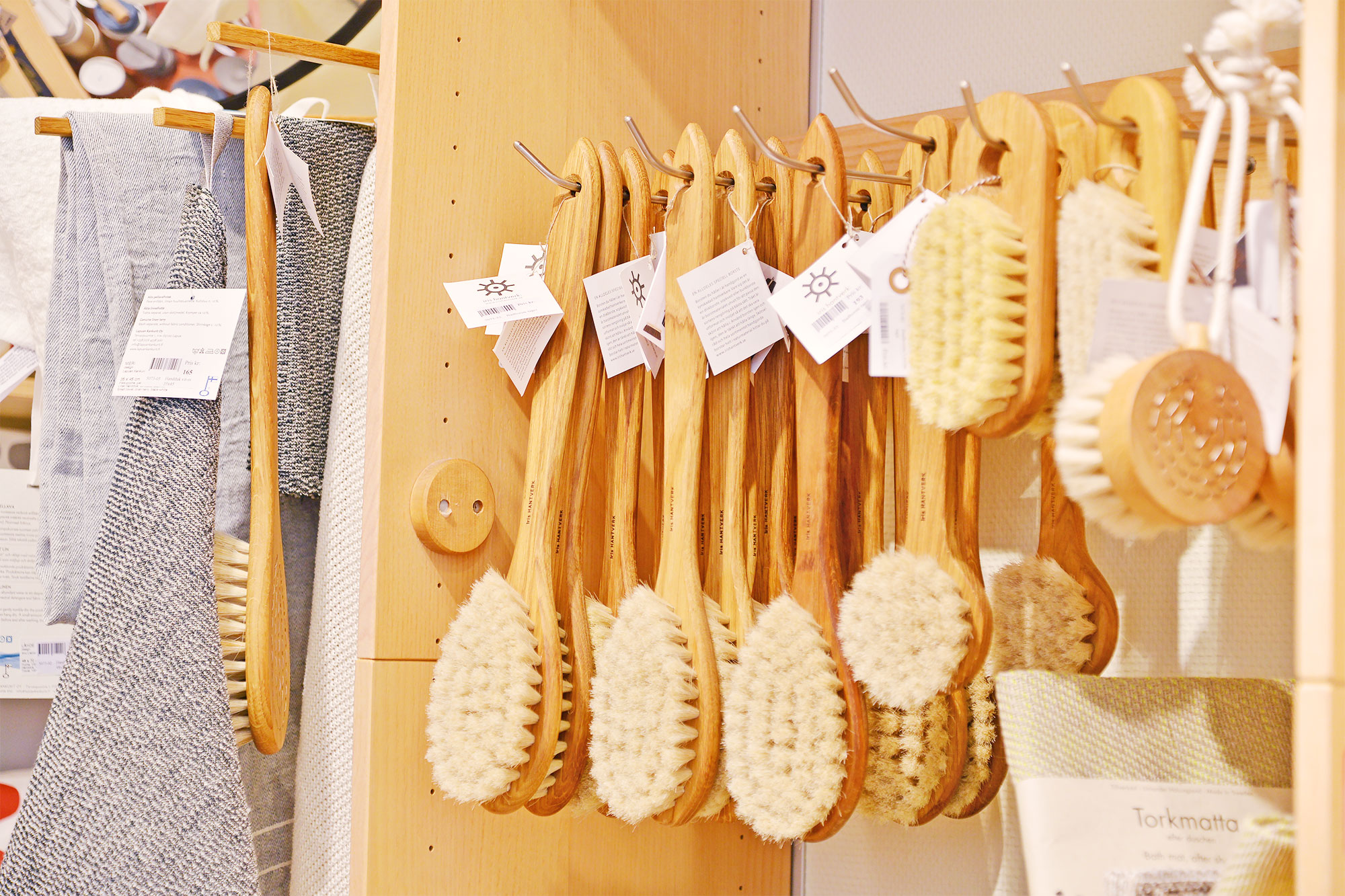 クングス通り〈Kungsgatan〉にある、スウェーデンで100年以上もの歴史を持つ老舗のブラシメーカー、イーリス・ハントヴェルク〈Iris Hantverk〉もぜひ行ってみてほしい!馬の毛やサボテン繊維など、天然素材にこだわったブラシの数々。皮もむけるベジタブルブラシや、きのこのブラシなど、いろんなカタチのブラシが並んでおもしろい。自分用に小さなテーブルブラシを購入。これは、テーブルに上に物を置いて撮影するときに活躍します。