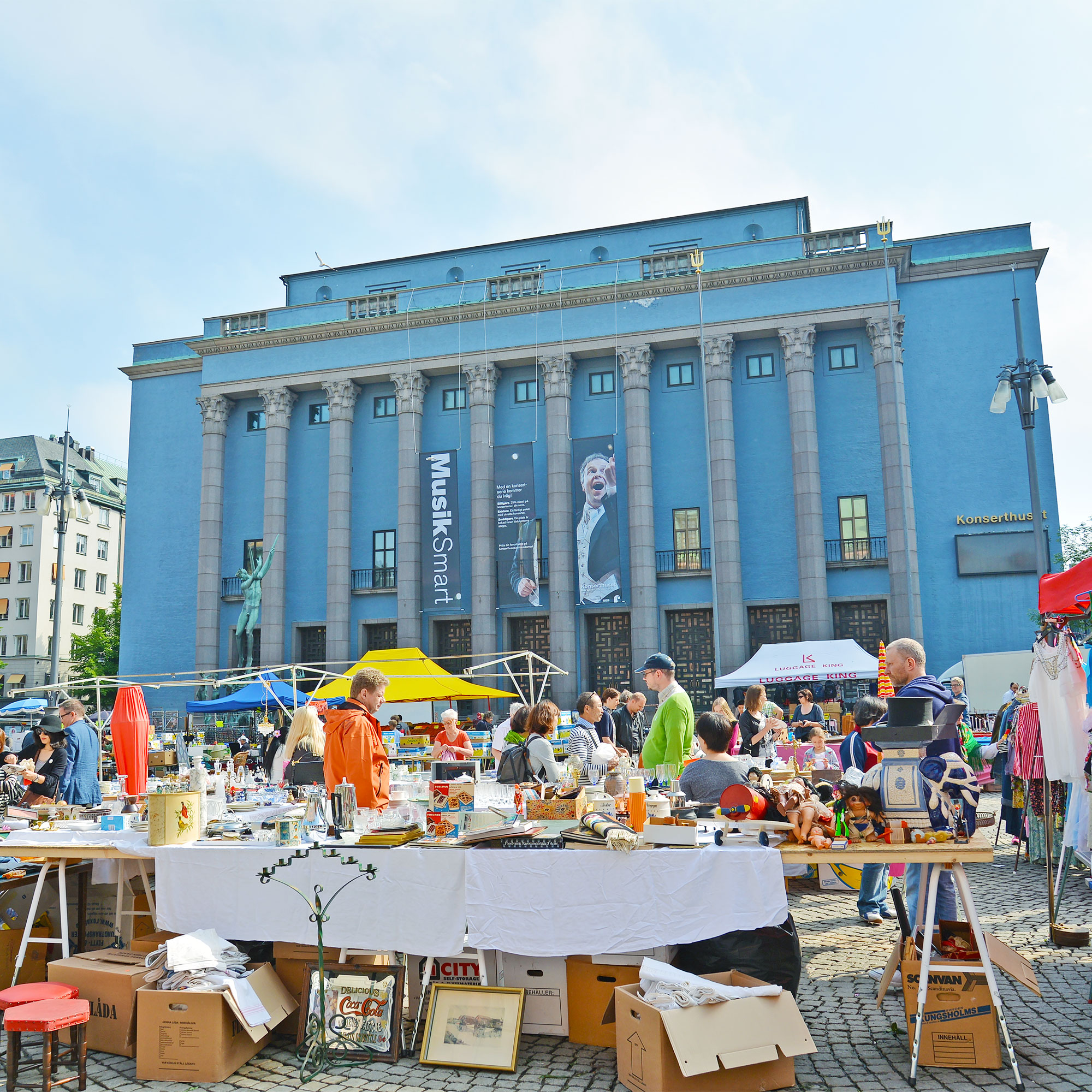 セルゲル広場〈Sergels Torg〉から北にのびるセルゲルガータン通り〈Sergelgatan〉を通って、ウィークデイは青空市場でにぎわうヒョートリエット広場〈Hötorget〉へ。ノーベル賞授賞式が行われるコンサートホール〈Konserthuset〉前の広場では、毎週日曜日に「蚤の市」が開かれます。