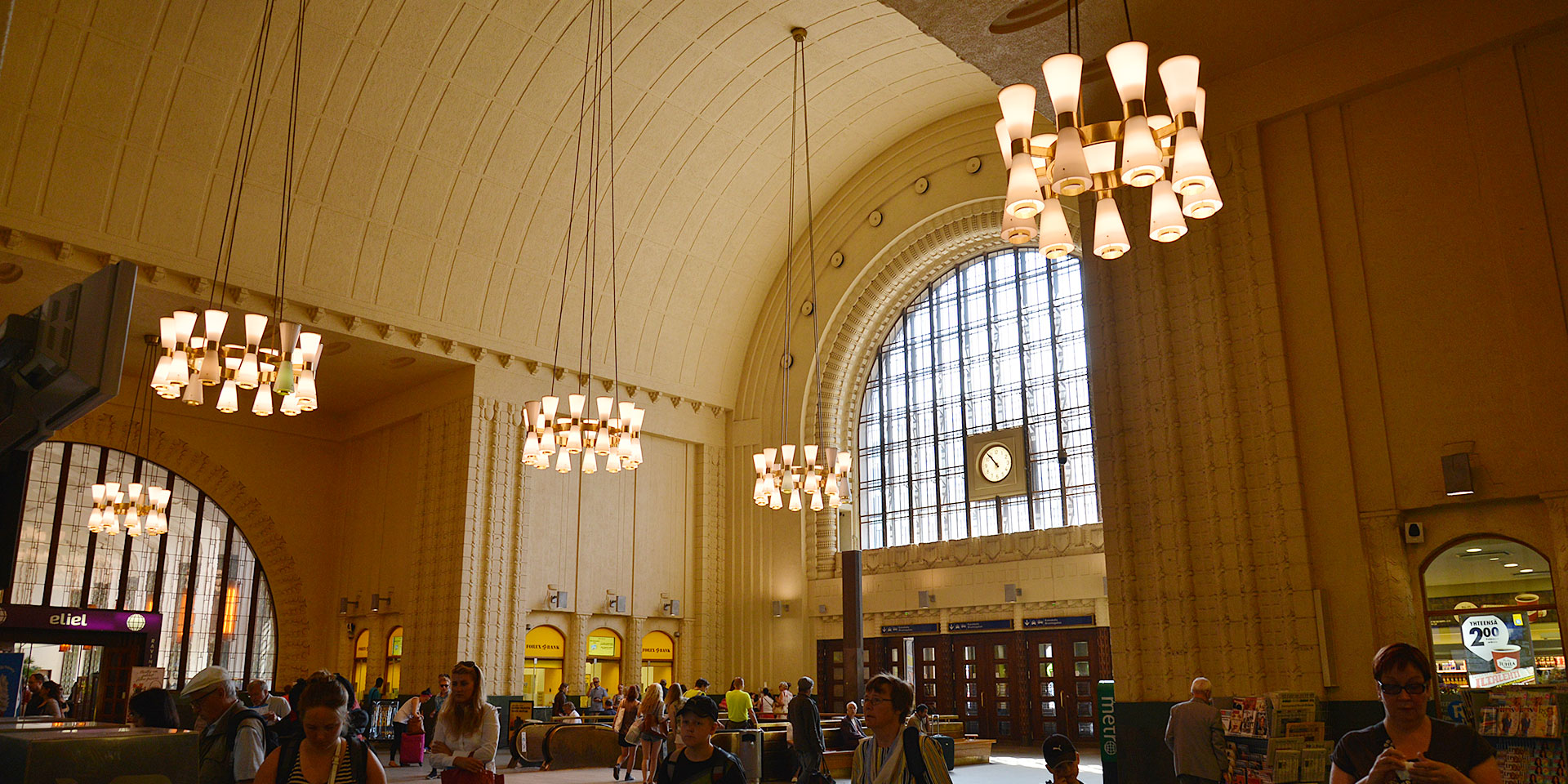 エリエル・サーリネン(Eliel Saarinen)が設計し、1919年に完成したヘルシンキ中央駅(Helsingin rautatieasema)は高さ48.5mの時計塔が印象的。駅の外装はフィンランド産の花崗岩で造られていて、アーチ型の正面入口には左右2体づつ、ランプを持った像が鎮座しています。 中に入ると、アーチ型の窓から琥珀色の光が差し込んで、駅舎と人のシルエットがとてもきれいでした。