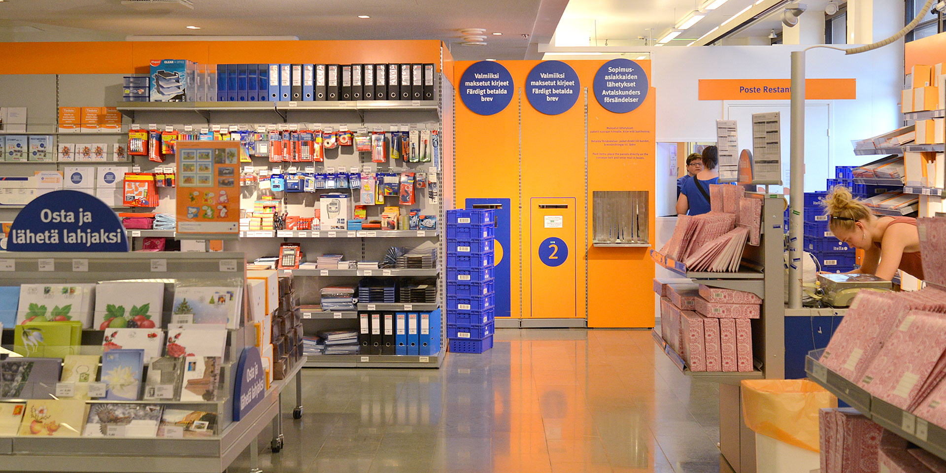 ヨーロッパでいち早く郵政民営化した国として知られるフィンランド。中央駅前には、オレンジとブルーのはじけるような水玉がかわいい中央郵便局ポスティ(Posti)があります。細長いポストも同じ色のオレンジとブルー。デンマークの赤いレトロなポストや、スウェーデンのライトブルーとイエローのポストもかわいかったけど、フィンランドやポップな水玉カラーは、それよりももっと郵便局が楽しくなる感じ。ポストカードや記念切手、ムーミンやマリメッコの限定小包用BOX、プチプチ封筒などグッズもいろいろあって、おみやげに選びに迷います。