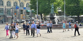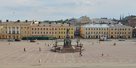 ヘルシンキ大聖堂の前には、約40万個の御影石が引きつめられたセナーティ広場(Senaatintori 元老院広場)が広がっています。街の中心に位置するこの広場は、ヘルシンキで最も古い歴史地区。石畳の真ん中には、かつてフィンランドを統治していたロシア皇帝アレクサンダー2世の像が建っています。