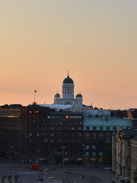 □写真左/ 中央駅前のソコスホテル・ヴァークナより。夜11時過ぎ、夕焼けに染まるヘルシンキ大聖堂。