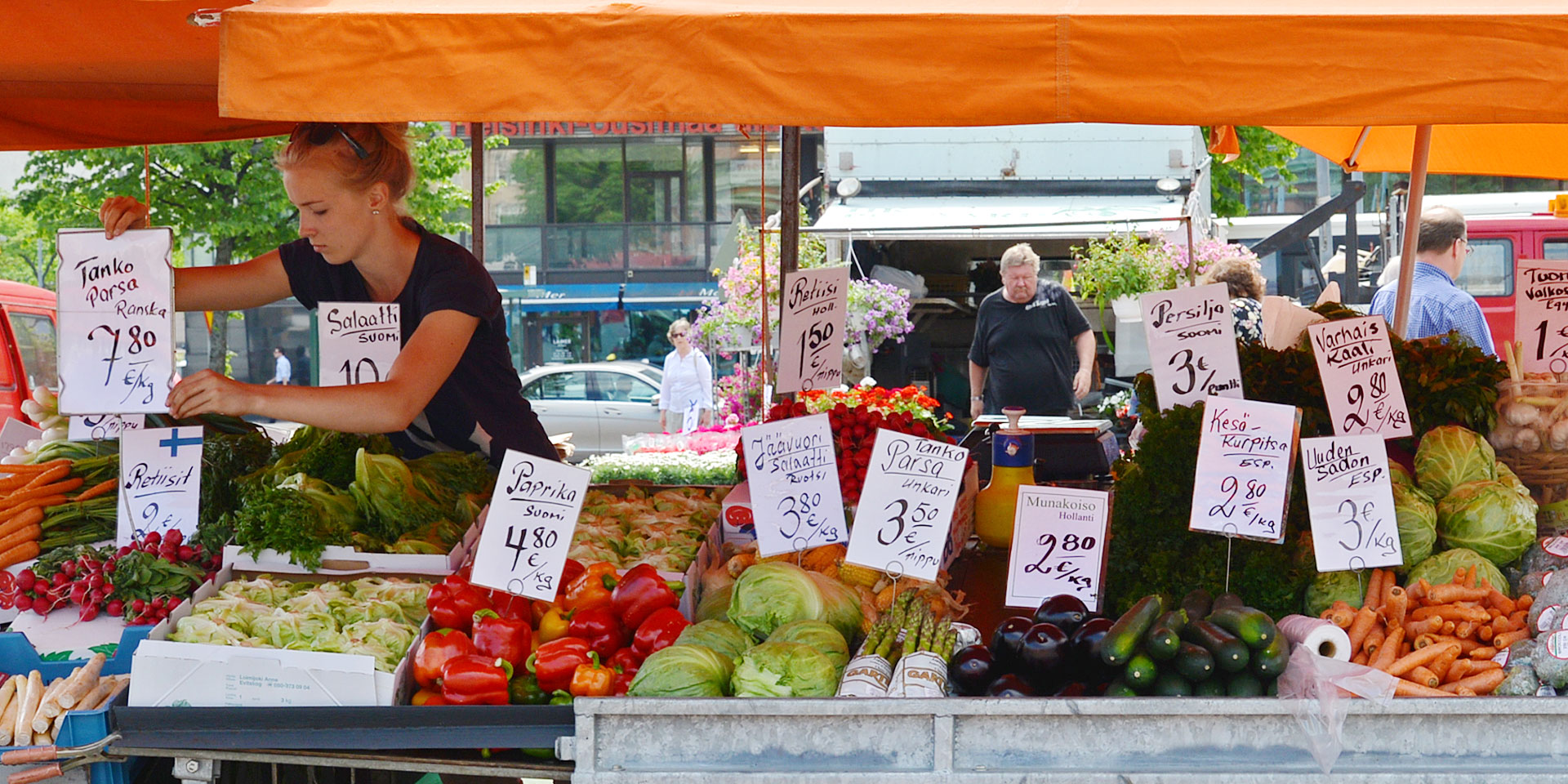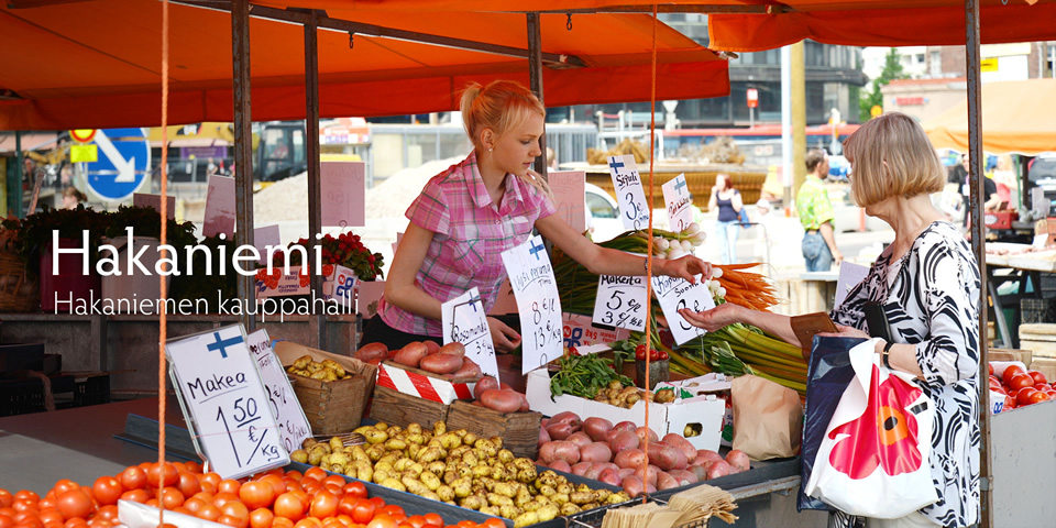 100年以上の歴史を持つヘルシンキ市民御用達のマーケットは、メトロとトラムのハカニエミ(Hakaniemi)駅の目の前にあります。(中央駅から地下鉄で2駅。トラムでもすぐです)夏場は広場に、野菜や果物を売るオレンジ色の露店や花屋さんなどがたくさん並んで、その奥には肉や野菜の食料品、生活用品や雑貨などのお店が入ったマーケットホールがあります。