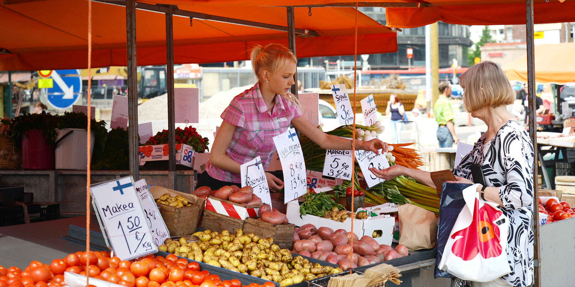 オレンジの屋根の露店には、フィンランドの野菜や果物がずらりと並んでいます。市場はほとんどが量り売りで、日本のようにラッピングされていないので、色とりどりの食材を見ているだけで楽しくなります。見たこともないような野菜もあれば、にんじんやカブみたいに、日本のものよりちょっと小ぶりでカタチがかわいいいものも。