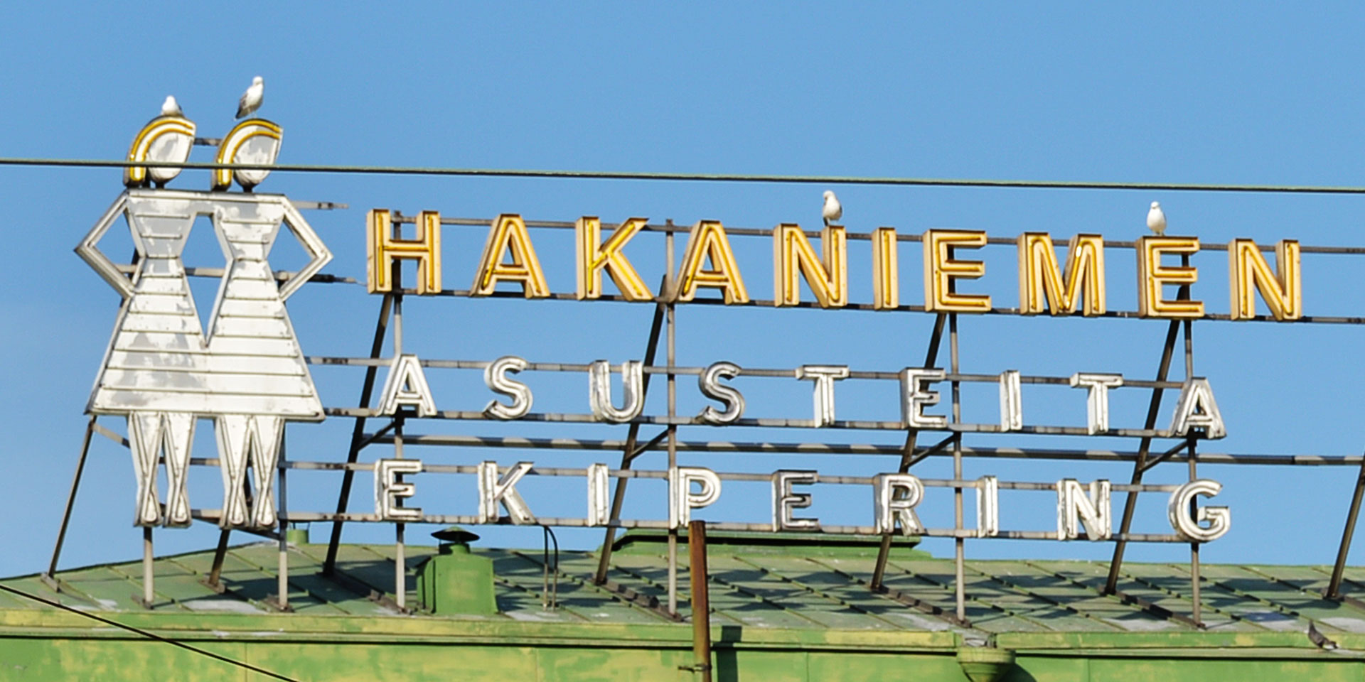 双子の女の子がキュートなハカニエミの看板。『かもめ食堂』で、ミドリ(片桐はいり)さんがフィンランド人に合うおにぎりの具を探しに訪れ、トナカイの肉を買っていったのが、ここハカニエミ・マーケットホール(Hakaniemen kauppahalli)。