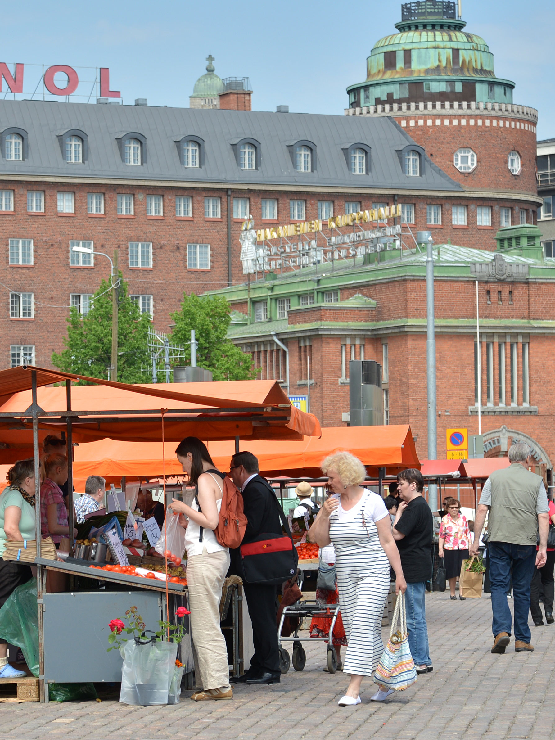 トラムに乗ってやってきたのは、ハカニエミ地区で1914年から続く老舗のハカニエミ・マーケットホール(Hakaniemen kauppahalli)。駅を降りるとすぐ、かわいいワンピースを着た双子の女の子がお出迎えしてくれます。マーケットホール前の広場には、オレンジ色のテントが並んで活気にあふれています。日曜日には蚤の市も開催されるそう。