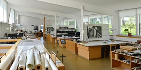 アアルトトークのあとは、ティートロリーがある階段を上って、アトリエ2階の製図室を見学。とても製図室とは思えないほどの広がりのある空間。真っ白な天井が傾斜して片流れの屋根になっているのは、ハイサイドから差し込む太陽の光を天井に反射させて、室内を明るくするため。ここでもアアルトの光が、スタッフの働く手を照らしています。