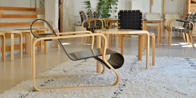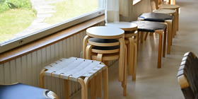 30代の若さで妻アイノとコンペを勝ち取ったパイミオの「サナトリウム」とは、結核患者の療養施設のこと。アアルトらしい波形のフォルムに、黄色の床と階段。ブルーの手すり。カラフルで明るいサナトウリムは、いかに患者が快適に過ごせるかを考えて設計されています。ラウンジに並ぶパイミオチェア(Paimio Chair)は、結核患者が楽に呼吸ができる座面の角度になっているのだとか。アームと脚が、フィンランドバーチの成型合板でつくられたパイミオチェア。この椅子の成功が、のちにアルテック創設へとつながっていくのです。