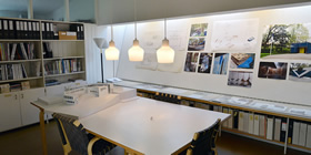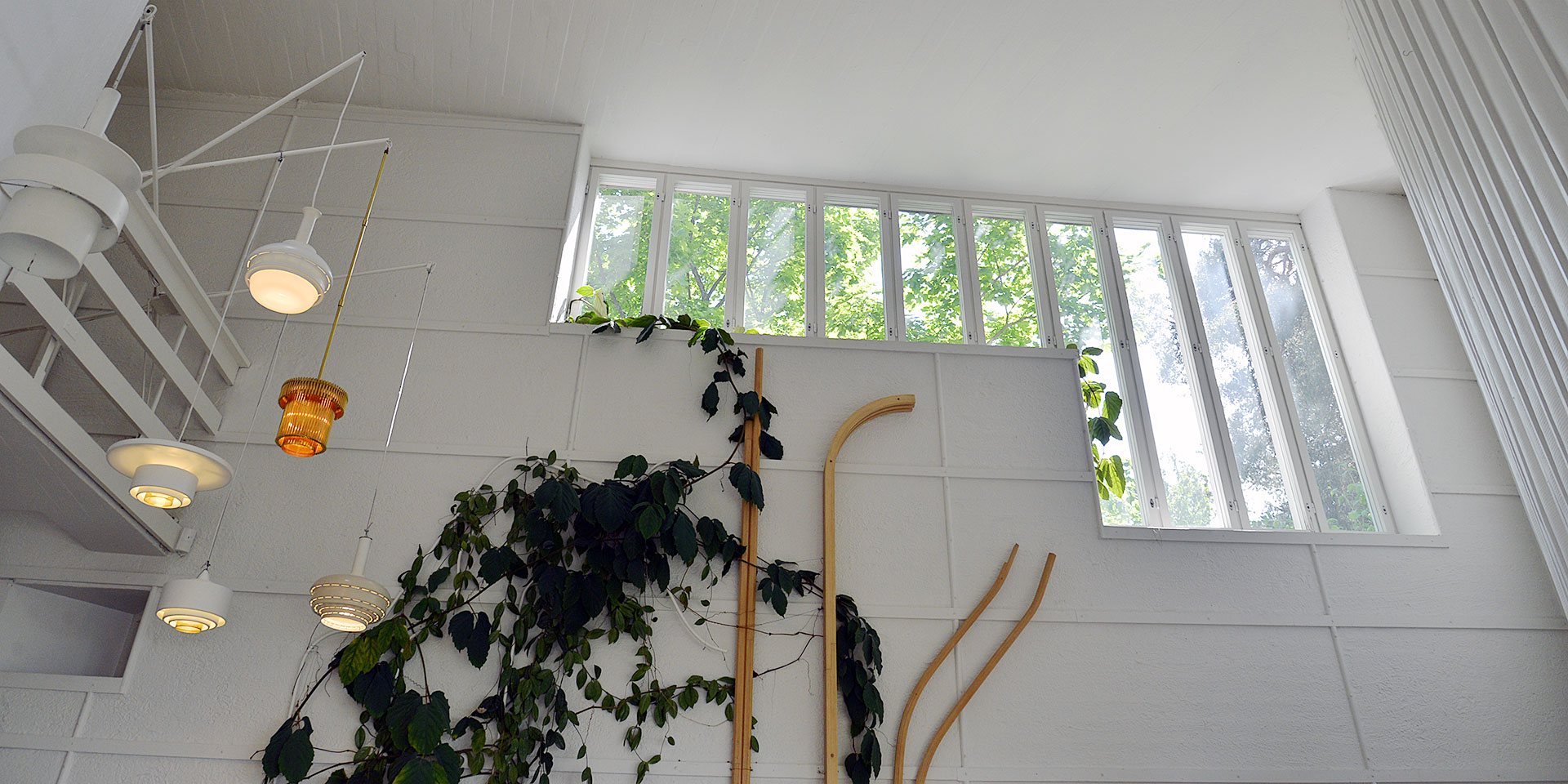 真っ白な吹き抜けのアトリエスペースの壁面にはツタを這わせ、プライウッドの曲げ木のサンプルが展示されています。アアルトの石像や建築模型、スツール60をはじめとするアルテック(artek)のチェアやテーブル、パイオミチェアがずらりと並び、ここはまるでアルテックのショールームやアアルトミュージアムのよう。この作業スペースは実験室のような空間で、プロジェクトが最終段階に入るとスタッフミーティングが開かれ、試行錯誤を繰り返していたそうです。コーナースペースに吊るされたデザイン照明は、明かりのテストを行うためのもの。天井のユニークな形をしたトップライトや、自然光を取り入れるための高い窓など、自然光を使ったアアルトの光の演出も見逃せません。