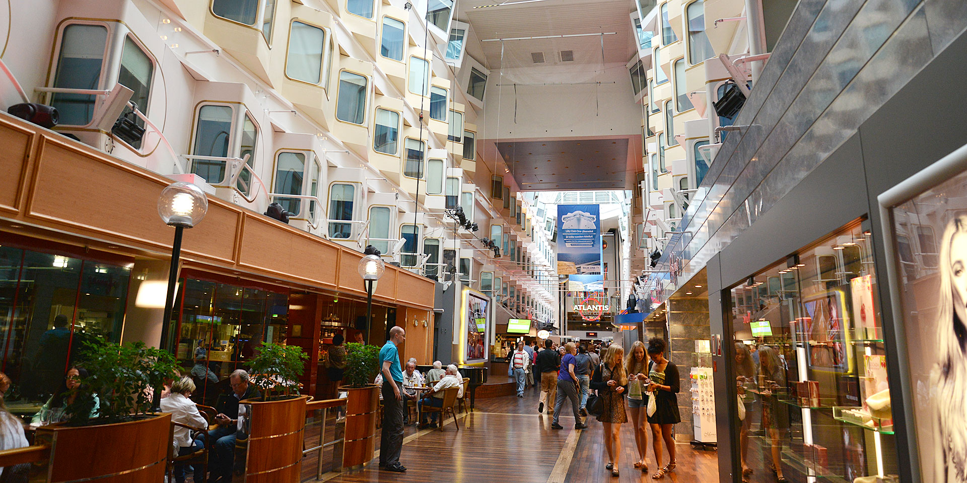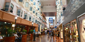 12階あるシリア・セレナーデ号の船内に入ると、そこは7階のメインデッキ。全長142m、高さ最大18mの吹き抜けのプロムナードが広がっています。プロムナードは、ショッピング・レストランアーケードとなっていて、いつも賑やか。ここではショーやパフォーマンスも開催されるそうです。ファッションやトレンドショップ、レストランやカフェ、パブやナイトクラブ、子供が遊べるチルドレン・アクティビティ・センターもあり、免税店へも行けます。