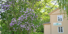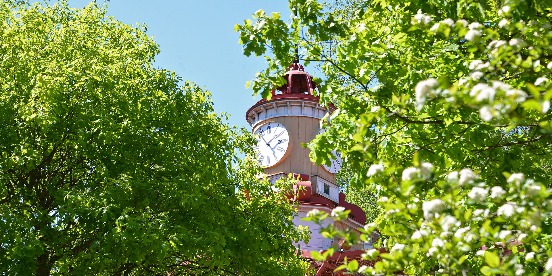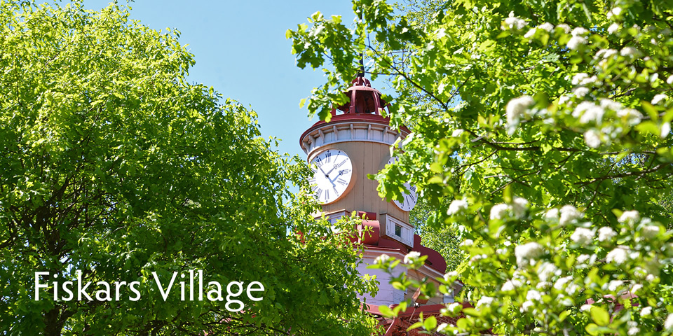 フィンランドの森と湖。パステルカラーの可愛い家や庭、満開のライラックが瞳の中へ飛び込んできます。バスに揺られる時間さえ夢心地。ゆるやかな川の流れに沿うように道をすすむと、あふれる緑の中にフィスカルス村のあの時計塔が見えてきました。