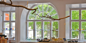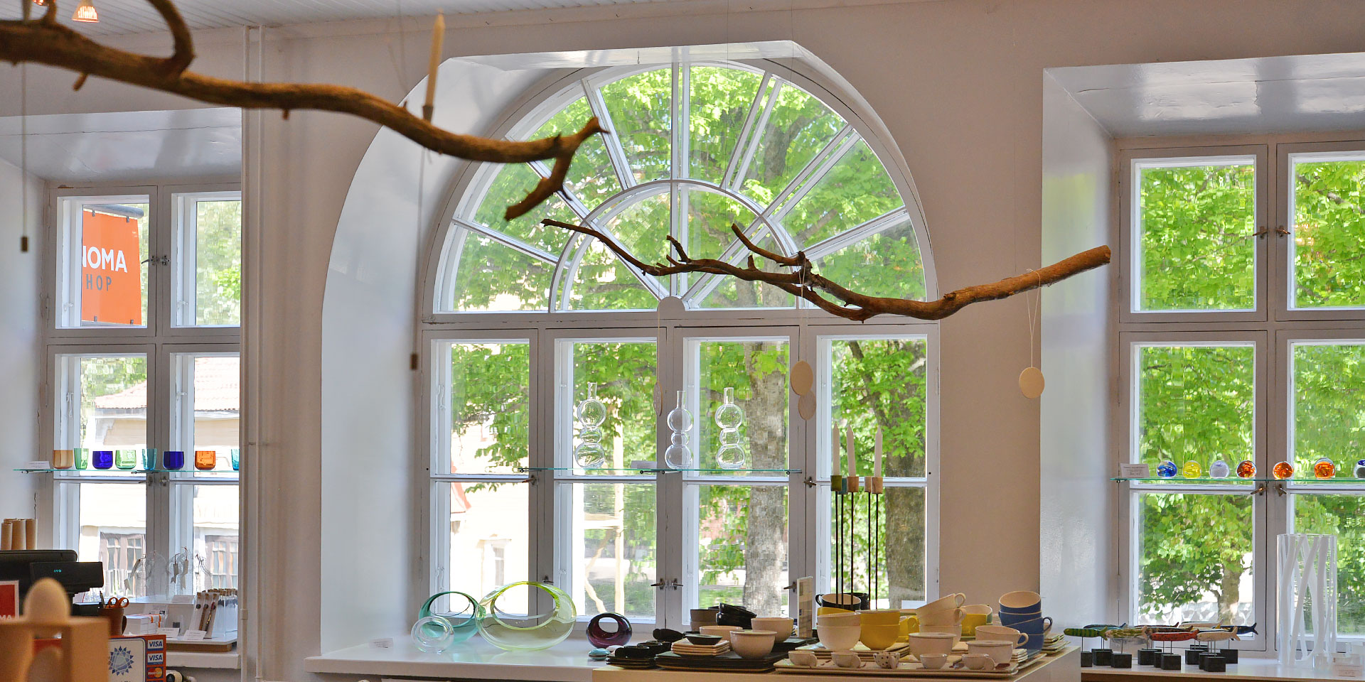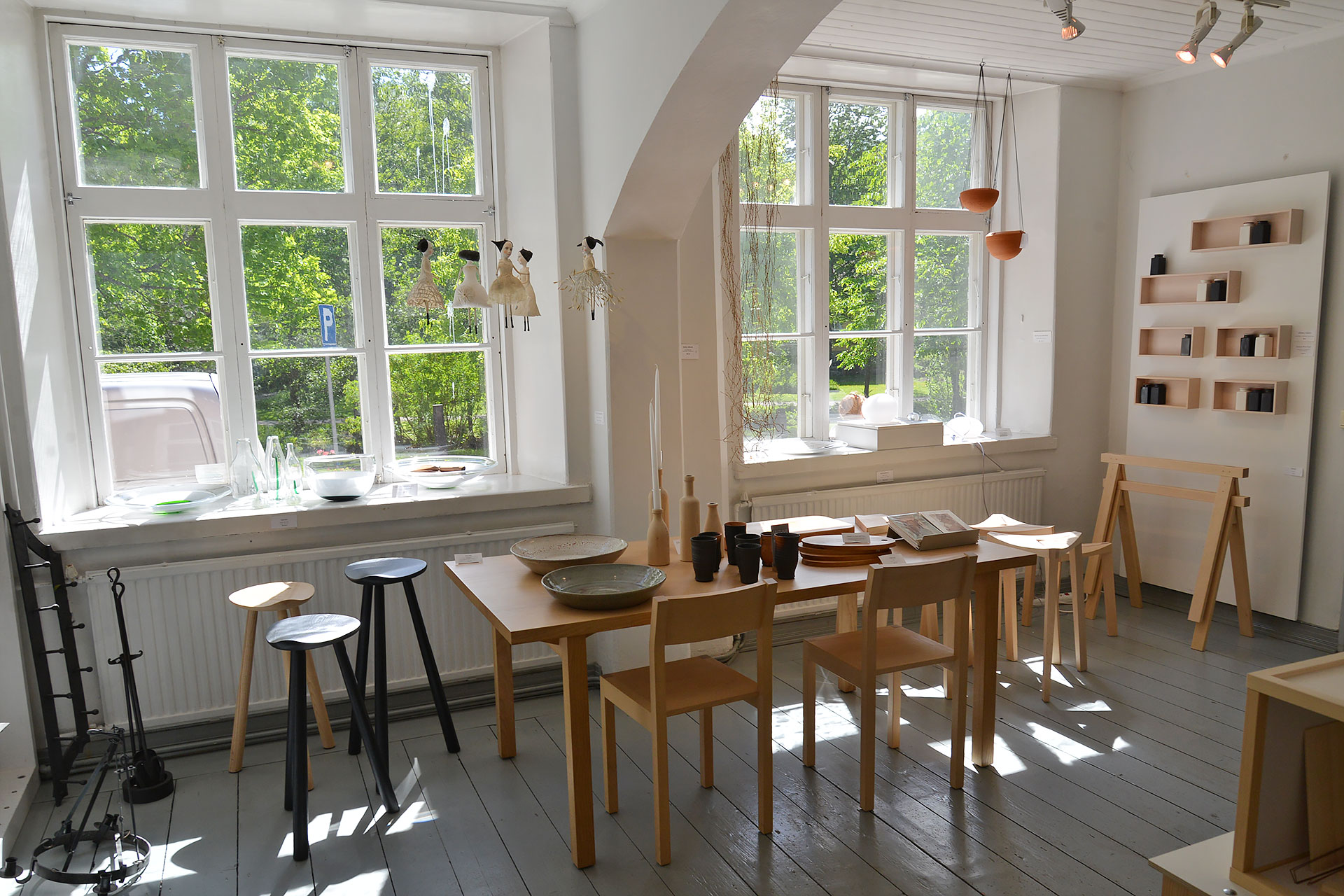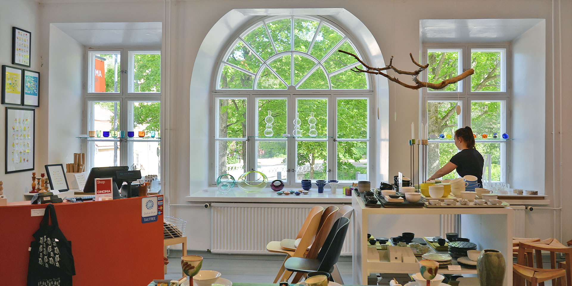 フィスカルス村でつくられた質の高いアートやクラフトは、時計塔の ONOMA(オノマ)ギャラリーショップで見ることができます。ONOMAはフィスカルス・アーティスト組合が直営するショップで、フィスカルスで制作しているアーティストの作品を展示販売しています。カミラ・モーベルグ(Camilla Moberg)のガラスや、陶磁器やニットやテキスタイル、絵画やオブジェやアクセサリー、鉄のアート、木目が美しいニカリ(NIKARI)の家具も素敵でした。