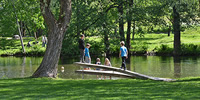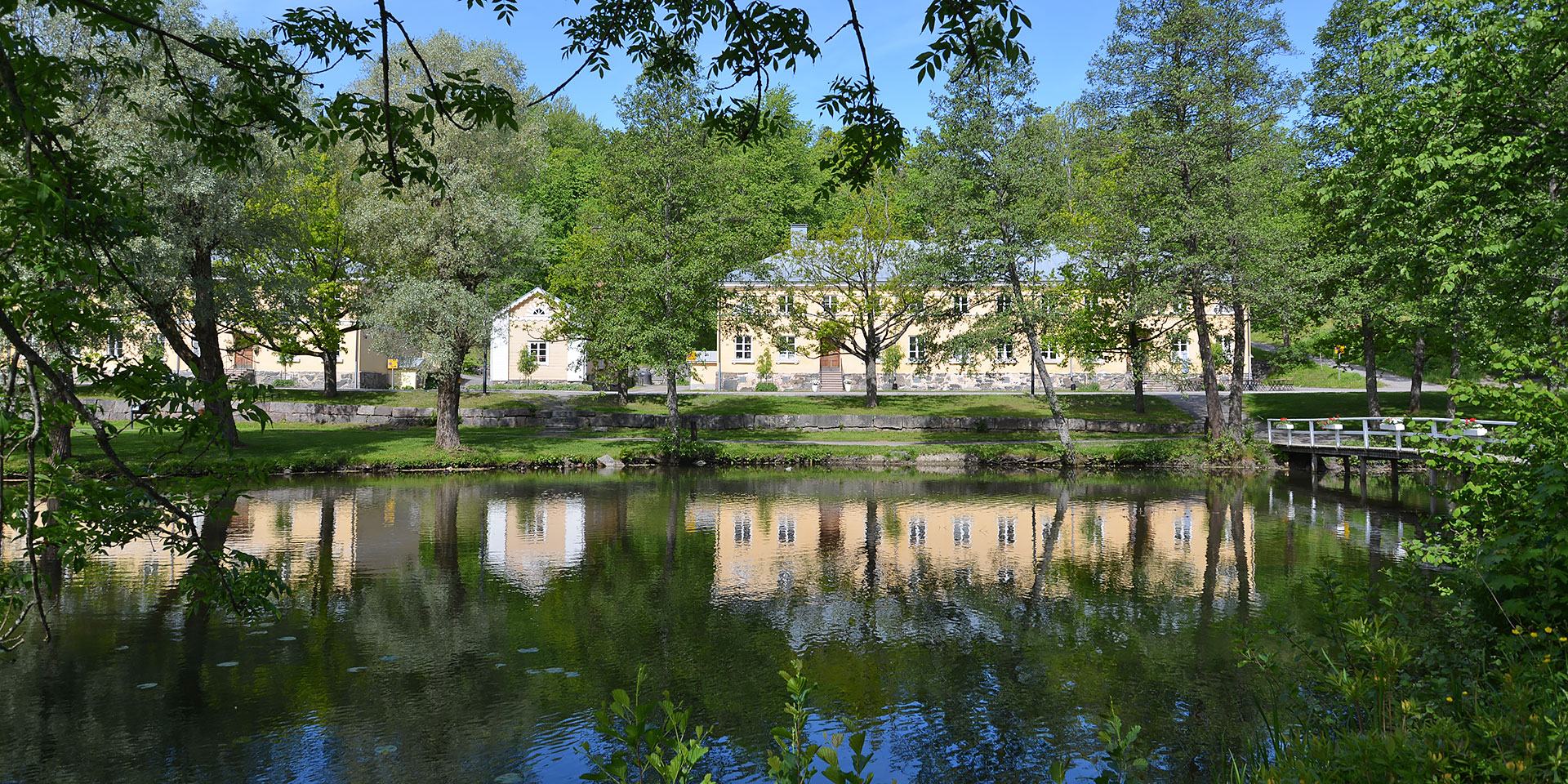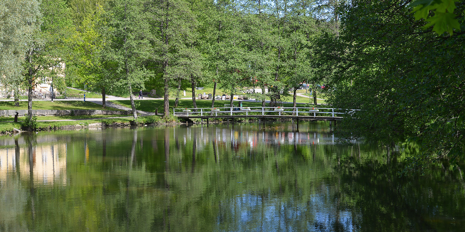 でも私が訪れた6月のウィークデーは、観光地とは思えないほど静かで、のどかで田舎の風景があるだけでした。カルヤー(Karjaa)から乗ってきたバスは、夏にマーケットが開かれる広場の前に到着。観光客も数えるほどで、バス停前のツーリスト・インフォメーションもまだ開いていません。フィスカルス川に沿って時計塔まで歩くと、製鉄所時代に造られた歴史ある建物が木立の間から見え、小川には赤い花が飾られた小さな橋がかかっています。川面に鏡のようにうつる、木々のきらめきにうっとり。この村の美しさは、川とともにあるのです。
