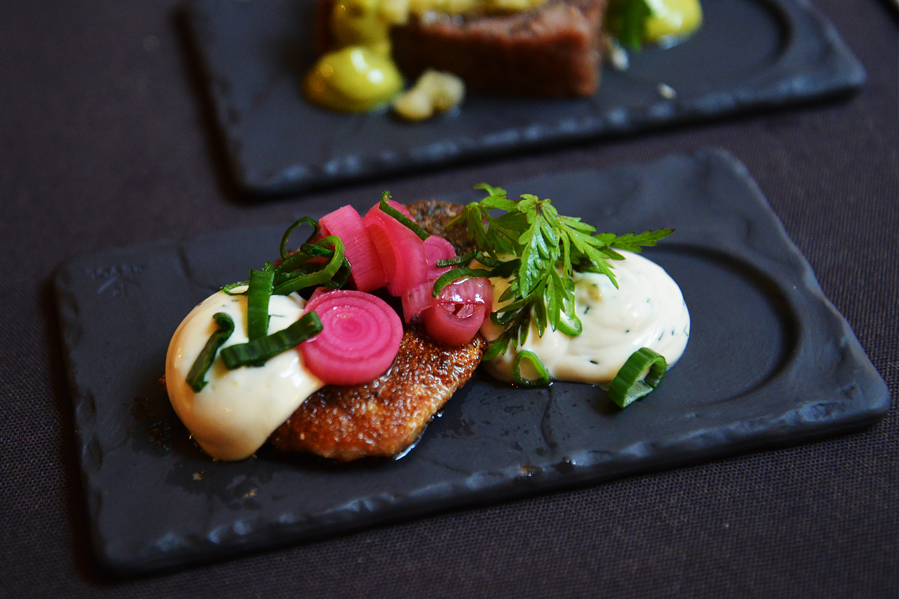 □写真上/ ラヴィントラ・ユーリの小皿料理サパス、卵とコールドスモークのニジマス
