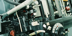 □写真左/ 1960年代に製造されたドイツ・ハイデルベルグ(HEIDELBERG)社製の活版印刷機「プラテン」
