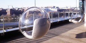 最上階の屋上にはスパ(サウナと温水プール)があり、ホテルのとんがったヘッド部分のルーフテラスへ出ることができます。(※残念ながらスパは利用しませんでした)展望テラスにはなんと、フィンランドのバブルチェア(Bubble Chair)が! エーロ・アールニオ(Eero Aarnio)がデザインしたシャボン玉のような椅子に揺られながら、クングスホルメン島やストックホルムの絶景を堪能できます。