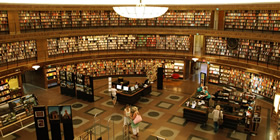 市立図書館へは地下鉄のグリーンラインに乗ってウーデンプラーン(Odenplan)駅で下車、歩いてすぐ。オデン通り沿いの裏口からも入館できるとか。このメインストリートはお店も多く、近くにはアンティークショップが並ぶウップランズ通り(Upplandsgatan)があります。北欧ヴィンテージが豊富なバッカス・アンティーク(Bacchus Antik)も歩いていけます。