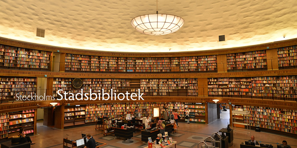 ストックホルム市立図書館(Stockholms Stadsbibliotek)は、オレンジ色の円形ホールと周りを囲むキューブ形のフロアでできていて、シルエットがユニークで愛着がわきます。世界遺産の「森の墓地」には行けなかったので、どうしてもアスプルンドの建築物を見たかった! スヴェア通りから公園の池を通って、エントランスの階段をのぼると……感動。素晴らしすぎます。こんなところで本を読み、何か学べたらどんなに幸せだろう。 みなさん、本物の図書館は北欧にあります!
