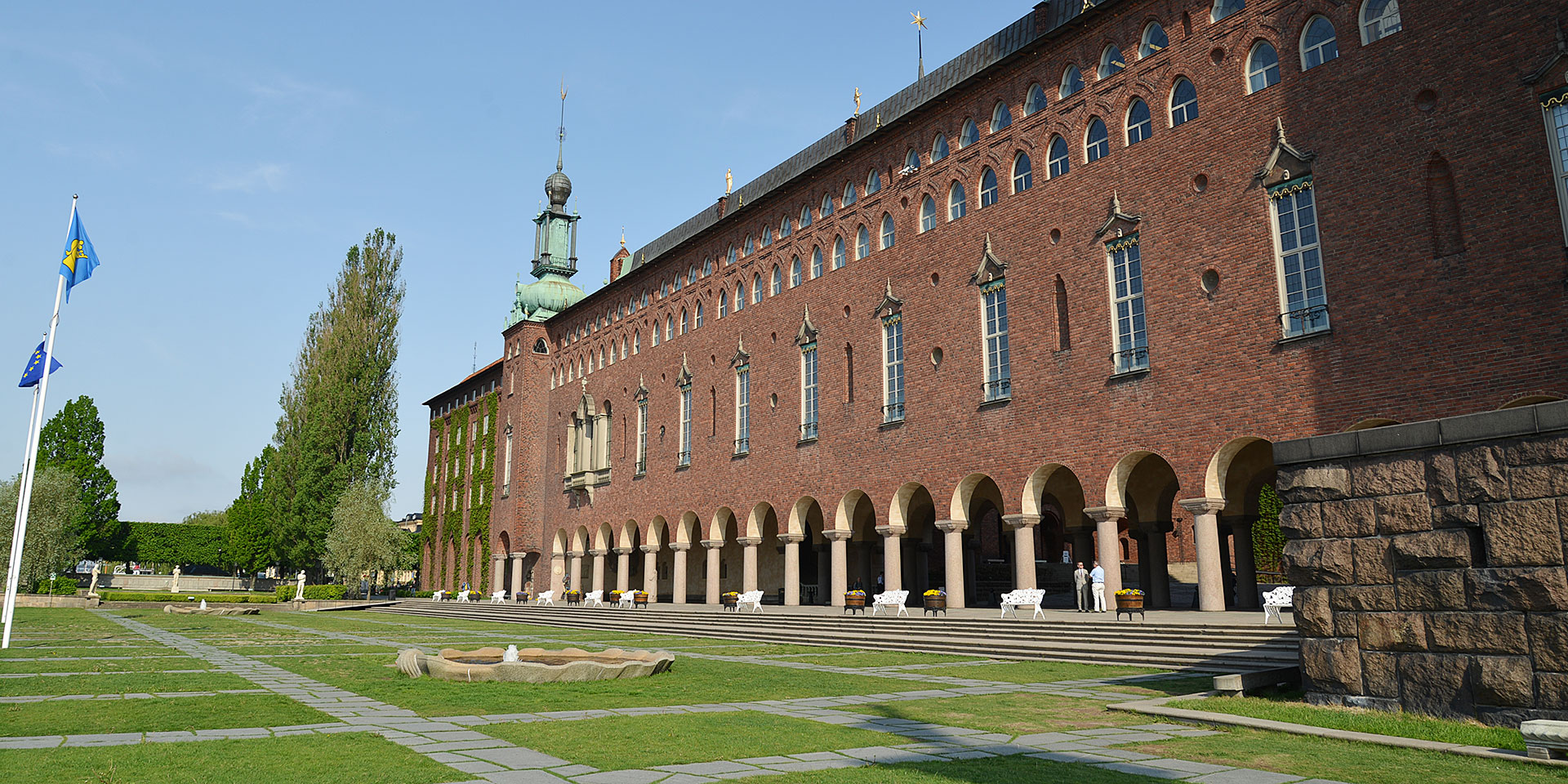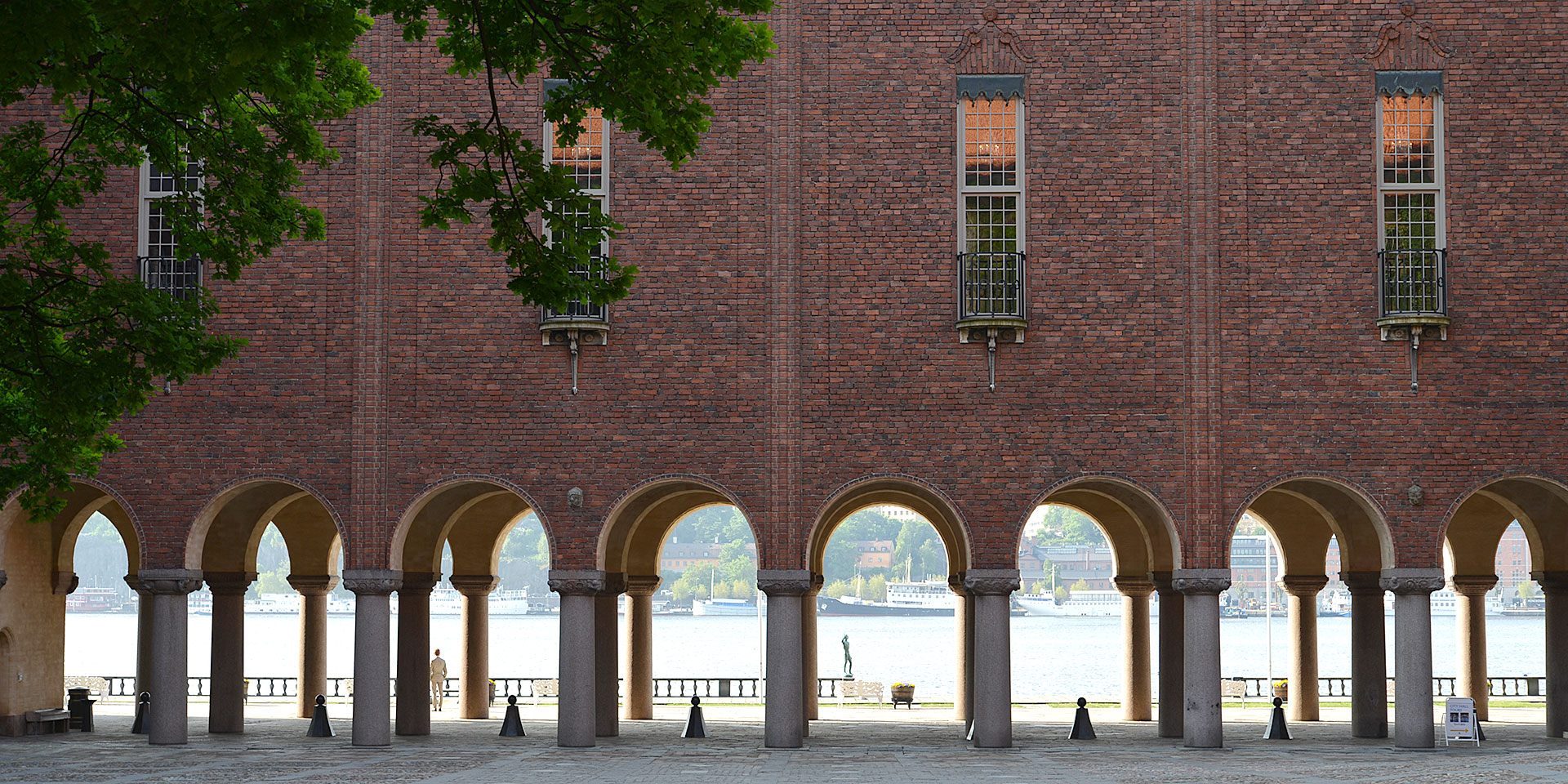中央駅(Stockholm Central)から徒歩10分。橋を渡るとすぐに、クングスホルメン島(Kungsholmen) にそびえる赤レンガ造りの市庁舎が見えてきます。ナショナル・ロマンティシズム建築の傑作としても知られる市庁舎には、イタリアのピアッツァをモデルにした市民の中庭と、ストックホルムのシンボルともいえる高さ106mの展望塔があります。