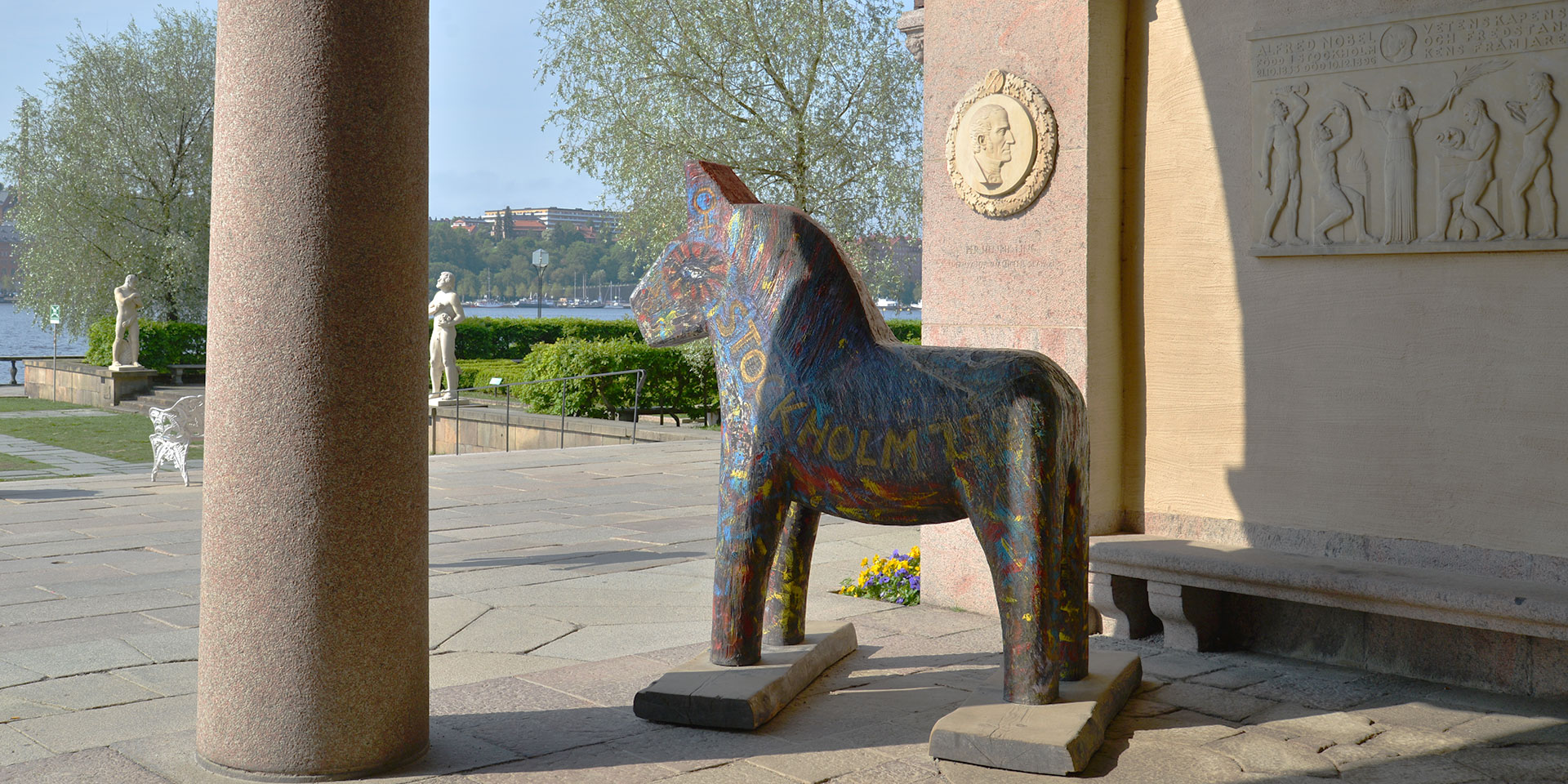 市庁舎の入口には、メーラレン湖を望むダーラヘスト(Dalahäst)の石像が。ダーラヘストとはダーラナ地方の伝統工芸品で、日本ではダーラナホースとしても紹介される木彫りの馬のこと。「幸せをもたらす馬」として世界中の人びとから愛されています。