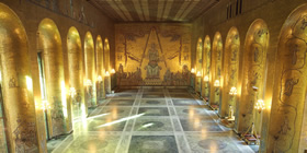 市庁舎の二階には、1900万枚の金箔のモザイクで飾られた黄金の間があります。黄金の間の上座には「メーラレン湖の女王」の壁画が描かれていて、女王の右手には西洋をあらわすニューヨークやパリの街並み、左手には東洋をあらわすエキゾチックな絵が描かれています。ガラスの間に溶かし入れた金箔は、永遠に輝きが失われることはないのだとか。黄金に輝くこのホールで、ノーベル賞受賞祝賀会のダンスパーティーが開かれるそうです。