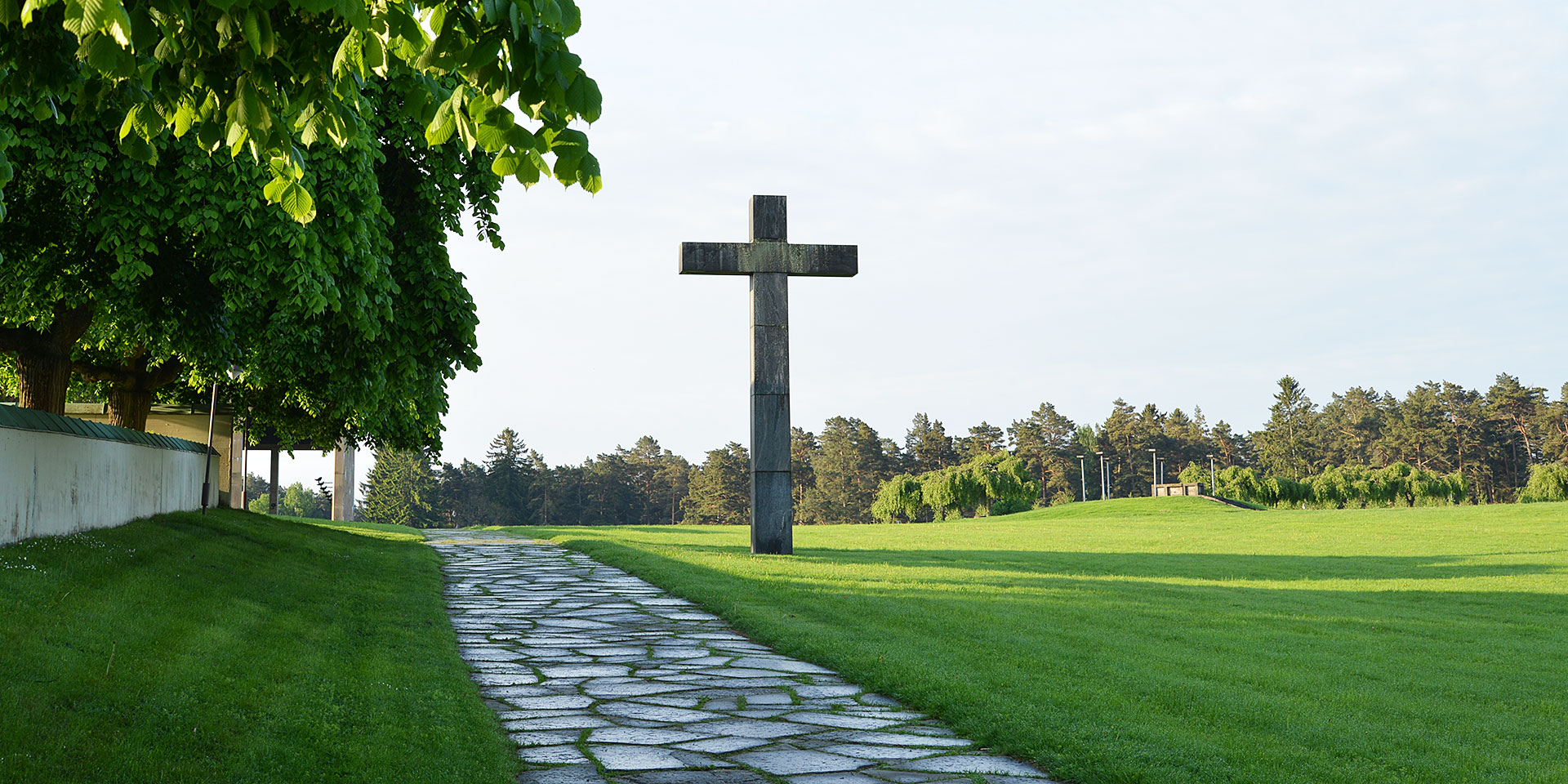 地下鉄中央駅からグリーンラインに乗って南へ約15分。スクーグスチルコゴーデン(Skogskyrkogården)駅で下車。菩提樹の並木道をぬけて石垣の入口へたどり着くと、ふっと視界がひらけ、緑あふれるランドスケープが!まっすぐ伸びた石の小道の先には、あの巨大な十字架がたっていました。