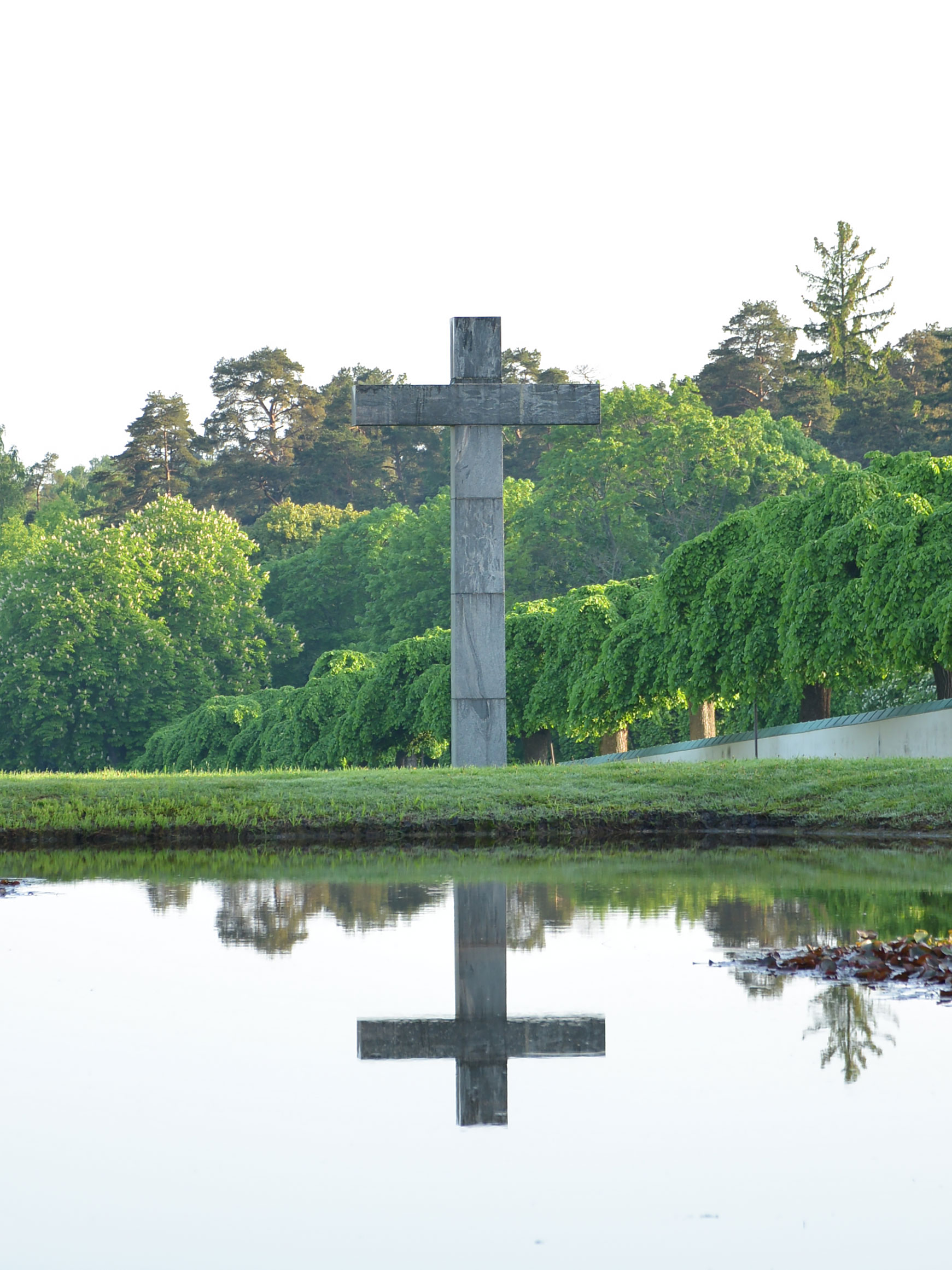 アスプルンドの十字架と、レーヴェレンツの冥想の丘のあいだには、ふたつを鏡のように映す小さな泉があります。花崗岩の十字架に触れた時の、ひんやりとした清らかな感触。冥想の丘に立ち、森を見渡した時の、静寂と神秘的な景観。不思議なのは、この墓地には、あたたかさが潜んでいるということ。生きた森につつまれているということ。自然と建築が美しく融け合い、あの泉のように、「生」から「死」、「死」から「生」を映し出しているのです。